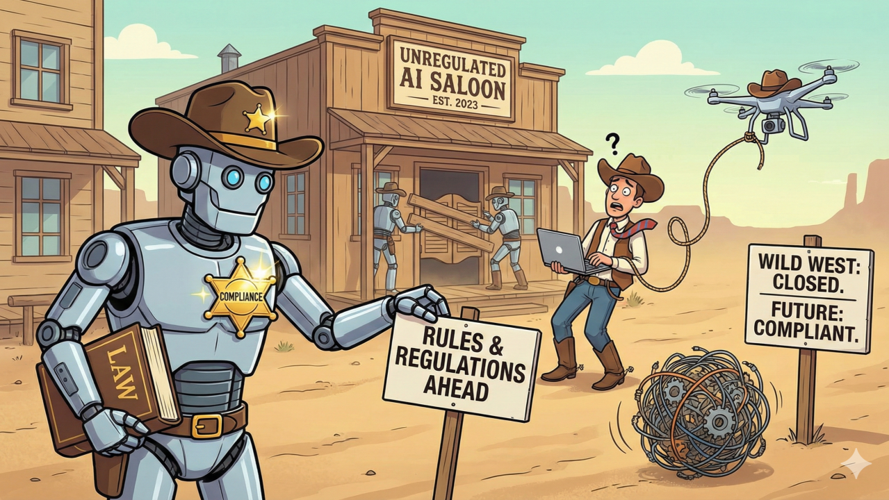 Imagine walking into a dusty town where there are no stars on any chests and the only rule is that there are no rules. You have people riding horses through the middle of the saloon, someone is trying to sell you a map to a gold mine that does not exist, and every time you turn a corner, someone is shouting at you to buy a bottle of magic hair growth tonic. This sounds like a scene from an old movie, yet it is exactly how the world of artificial intelligence has felt for the last couple of years. Your company leaders probably acted like the pioneers of old, racing across the plains to claim as much land as possible before anyone else could get there. They told you to move fast and they told you to use these new AI tools for everything from writing emails to making phone calls. They did not give you a map, they did not give you a handbook on how to treat the neighbors, and they certainly did not check to see if what you were doing was actually allowed. You were just told to find the gold and bring it back to the office as quickly as you could. Now, the dust is starting to settle and you are realizing that the gold is getting harder to find. Your lead generation is drying up like a creek in a heatwave, and your cold calling efforts are being met with locked doors and angry faces. The truth is that the law has finally arrived in this wild territory, and if you do not start pinning on a badge and following the rules, you are going to find yourself in a lot of trouble.